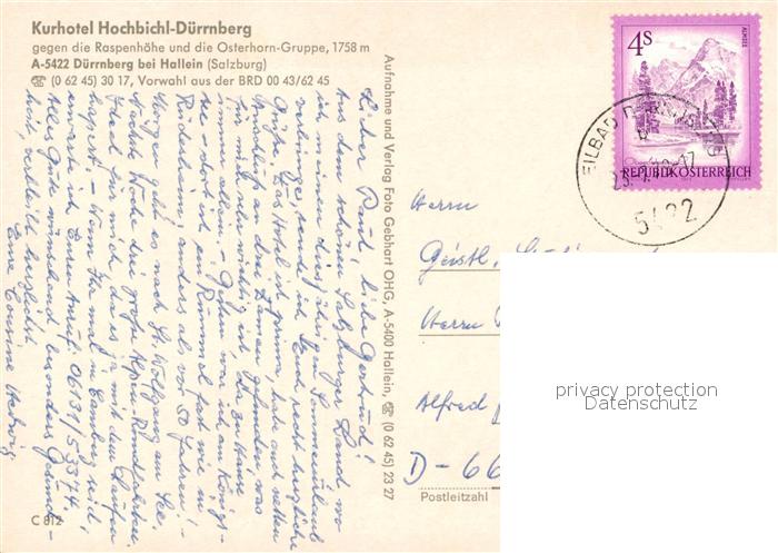 73587759 alte Postkarte Duerrnberg Hallein Kurhotel Hochbichl Duerrnberg gegen Raspenhoehe Osterhorngruppe postalisch gelaufen Erhaltung siehe scans [FriedD77] KatCode: 11390323050205