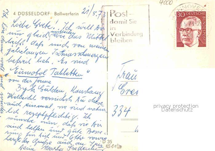 72914818 alte Postkarte Duesseldorf Ballwerferin Statue postalisch gelaufen Erhaltung siehe scans [FriedD77] KatCode: 11110005111000
