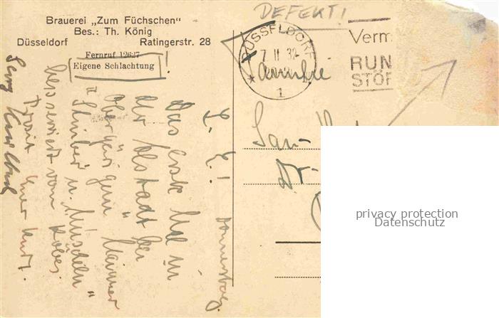 74150468 alte Postkarte DuessELDORF CITY Brauerei Zum Fuechschen Restaurant postalisch gelaufen Erhaltung siehe scans [FriedD77] KatCode: 11110005111000