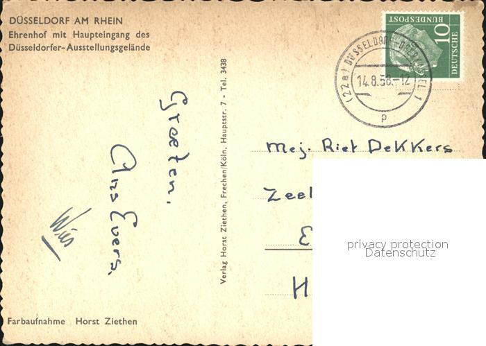 72435134 alte Postkarte DuessELDORF CITY Ehrenhof Haupteingang des Duesseldorfer-Ausstellungsgelaende postalisch gelaufen Erhaltung siehe scans KatCode: 11110005111000
