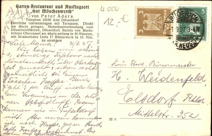 41317869 DuessELDORF CITY Garten Restaurant Gut Moechenwerth postalisch gelaufen gute Erhaltung Alte Ansichtskarte Postkarte alte Postkarte Stef Katcode 11110005111000