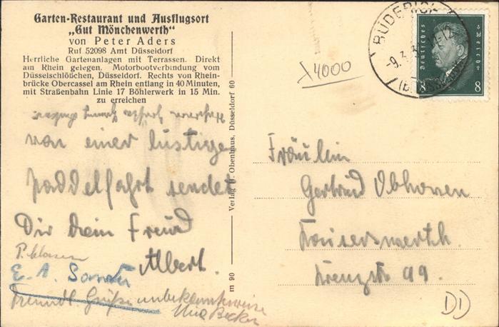 41398291 DuessELDORF CITY Gartenrestaurant Gut Moenchenwerth postalisch nicht gelaufen Alte Ansichtskarte Postkarte hz_W Katcode 11110005111000