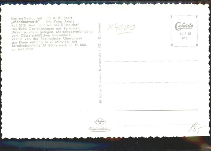 41398378 DuessELDORF CITY Gartenrestaurant Moenchenwerth postalisch nicht gelaufen gute Erhaltung Alte Ansichtskarte Postkarte hz_W Katcode 11110005111000