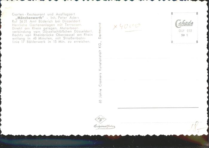 41398380 DuessELDORF CITY Gartenrestaurant Moenchenwerth Segelboot postalisch nicht gelaufen gute Erhaltung Alte Ansichtskarte Postkarte hz_W Katcode 11110005111000