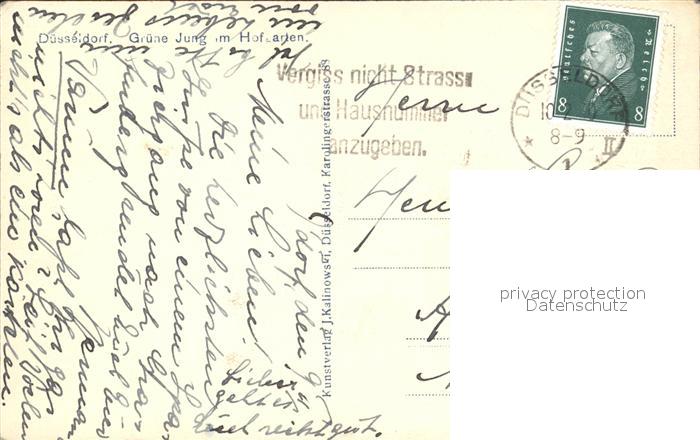 72146062 alte Postkarte DuessELDORF CITY Gruene Jung im Hofgarten postalisch gelaufen Erhaltung siehe scans KatCode: 11110005111000