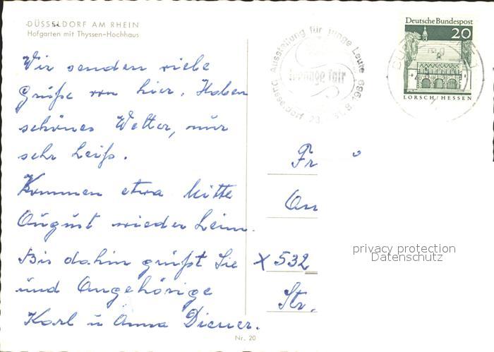 72227649 alte Postkarte DuessELDORF CITY Hofgarten mit Thyssen Hochhaus postalisch gelaufen Erhaltung siehe scans KatCode: 11110005111000