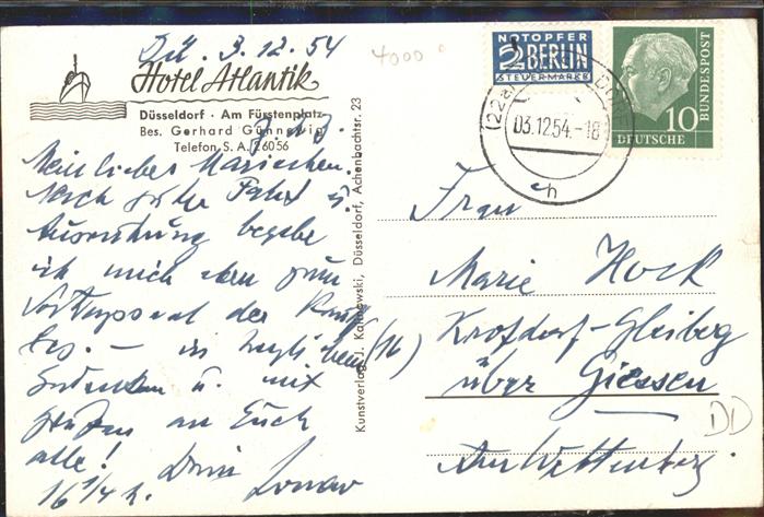 41398498 DuessELDORF CITY Hotel Atlantik postalisch gelaufen gute Erhaltung Alte Ansichtskarte Postkarte alte Postkarte hz_W Katcode 11110005111000