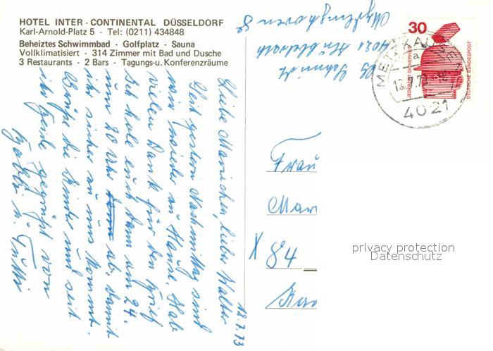 72626563 alte Postkarte DuessELDORF CITY Hotel Intercontinental Swimming Pool postalisch gelaufen Erhaltung siehe scans [FriedD77] KatCode: 11110005111000
