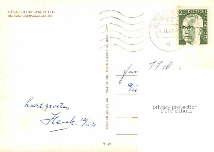 72785047 alte Postkarte DuessELDORF CITY Rheinufer und Rheinkniebruecke postalisch gelaufen Erhaltung siehe scans [WerneD78] KatCode: 11110005111000