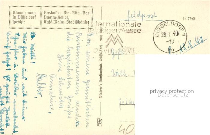 43275168 DuessELDORF CITY Stadt Schänke Schadowstraße postalisch gelaufen Feldpost Erhaltung siehe scans [KathaD81] Feldpost alte Postkarte Kath Katcode 11110005111000