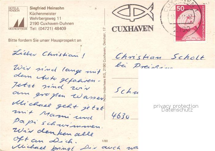 73758597 alte Postkarte Duhnen Cuxhaven Hotel Pension Meeresfriede Gaststube Hallenbad postalisch gelaufen Erhaltung siehe scans [FriedD77] KatCode: 11110003352011