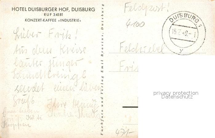 43190938 alte Postkarte Duisburg Ruhr Hotel Duisburger Hof Konzert Kaffee Industrie postalisch gelaufen Feldpost Erhaltung siehe scans [FriedD77] KatCode: 11110005112000