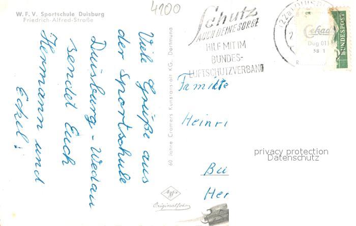 73696929 alte Postkarte Duisburg Ruhr W.F.V. Sportschule Friedrich- Alfred- Strasse postalisch gelaufen Erhaltung siehe scans [LiesaD40] KatCode: 11110005112000