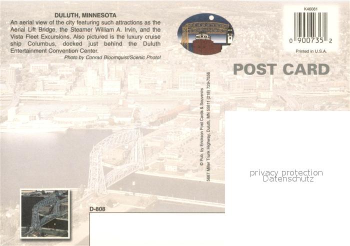73745170 Duluth Minnesota Aerial view Lift Bridge Steamer William Irvin and Vista Fleet Excursions postalisch nicht gelaufen Erhaltung siehe scans [FriedD77] KatCode: 14140250000000