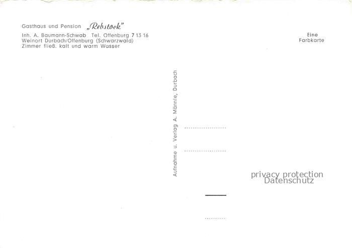 74156192 Durbach Baden Schwarzwald Offenburg BW Gasthaus Pension Rebstock postalisch nicht gelaufen Erhaltung siehe scans [FriedD77] KatCode: 11110008317021