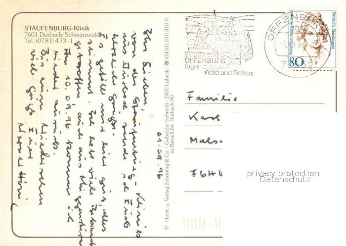 73129426 alte Postkarte Durbach Staufenburg-Klinik postalisch gelaufen Erhaltung siehe scans [PaolaD17] KatCode: 11110008317021