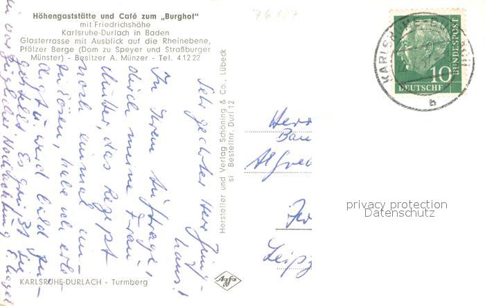 73652002 alte Postkarte Durlach Gaststaette Cafe zum Burghof mit Friedrichshoehe postalisch gelaufen Erhaltung siehe scans [FriedD77] KatCode: 11110008212000