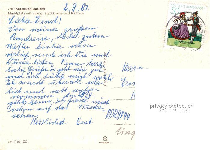 72698315 alte Postkarte Durlach Marktplatz mit ev Stadtkirche und Rathaus postalisch gelaufen Erhaltung siehe scans [WerneD78] KatCode: 11110008212000