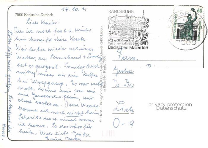 72654292 alte Postkarte Durlach Schloss Marktplatz Rathaus Kirche postalisch gelaufen Erhaltung siehe scans [WerneD78] KatCode: 11110008212000