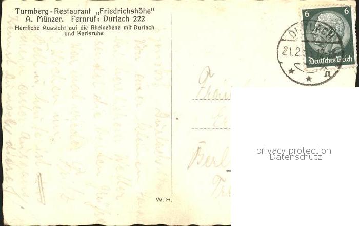 71848433 alte Postkarte Durlach Turmberg-Restaurant Friedrichshoehe postalisch gelaufen Erhaltung siehe scans KatCode: 11110008212000