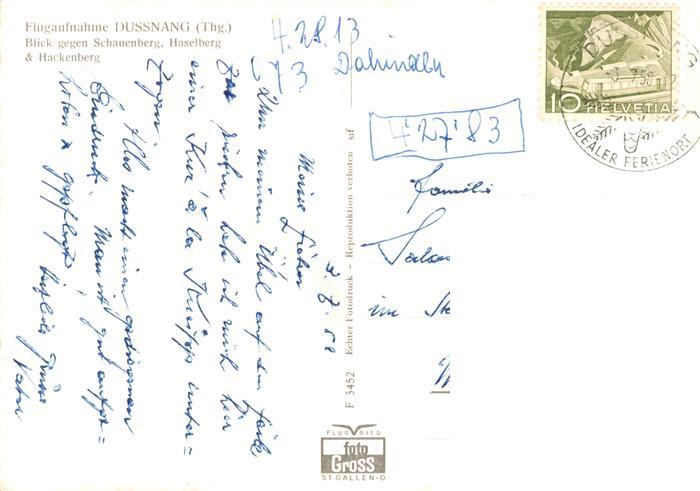 13872813 alte Postkarte Dussnang TG Fliegeraufnahme mit Schauenberg Haselberg und Hackenberg postalisch gelaufen Erhaltung siehe scans [WerneD78] KatCode: 11470200625582