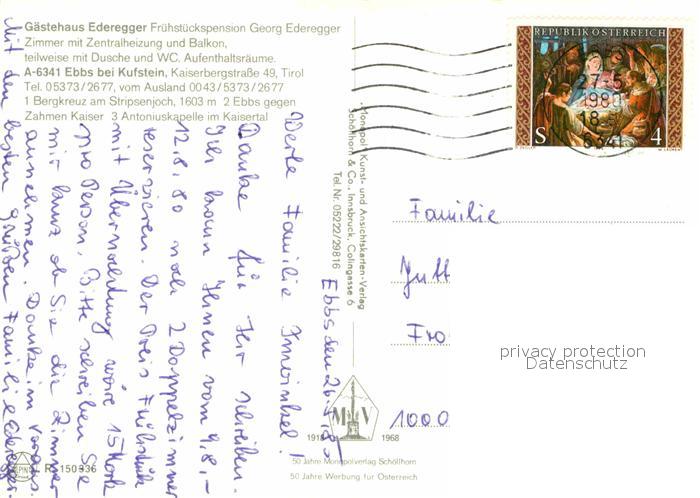 72619671 alte Postkarte Ebbs Gaestehaus Pension Ederegger Ortsansicht mit Kirche Kapelle Kreuz postalisch gelaufen Erhaltung siehe scans [FriedD77] KatCode: 11390335070508