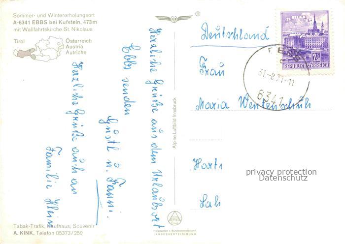 74075326 alte Postkarte Ebbs Kufstein Tirol AT mit Wallfahrtskirche St Nikolaus mit Kaisergebirge postalisch gelaufen Fliegeraufnahme Erhaltung siehe scans [WerneD78] KatCode: 11390335070508