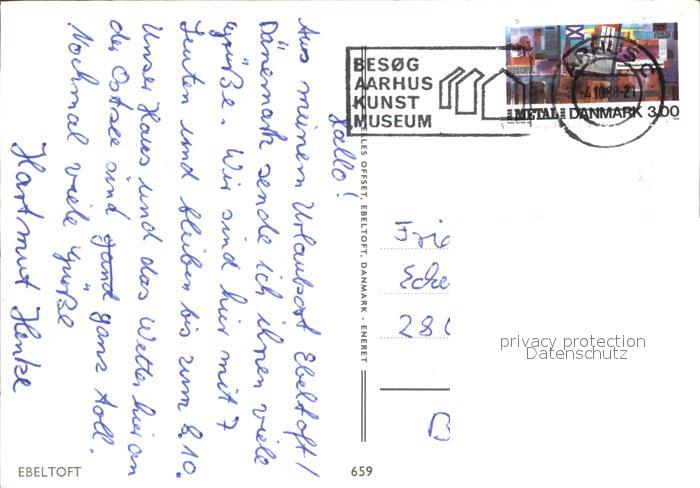 old postcard Ebeltoft Kirche Overgade Den Skave Bar postalisch gelaufen Erhaltung siehe scans