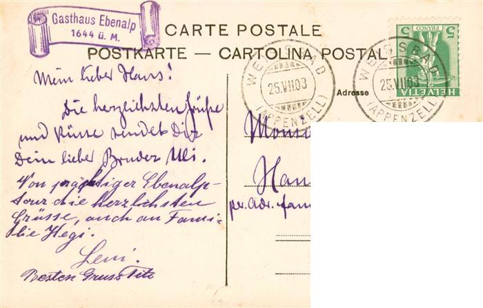 13925336 alte Postkarte Ebenalp 1641m AI Gasthaus Ebenalp postalisch gelaufen Erhaltung siehe scans [FriedD77] KatCode: 11470280010744