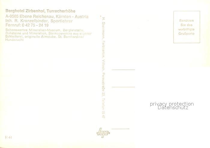73245798 Ebene Reichenau Kaernten Berghotel Zirbenhof Turracherhoehe See Alpen Berhardiner Hunde Souvenirs Mineralien postalisch nicht gelaufen Erhaltung siehe scans [FriedD77] KatCode: 11390212021007