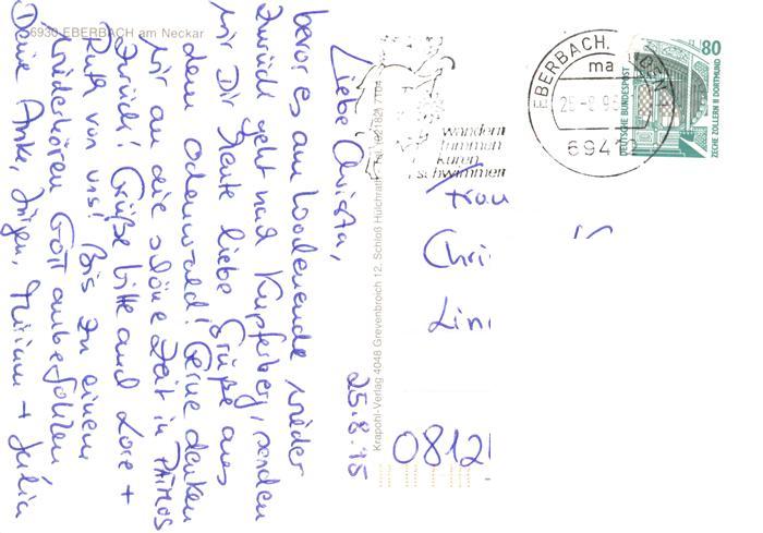 73945113 alte Postkarte Eberbach Baden Neckar Brunnen Pulverturm Kurzentrum Wasserspiele Rathaus Plastik Partie am Neckar postalisch gelaufen Erhaltung siehe scans [FriedD77] KatCode: 11110008226013