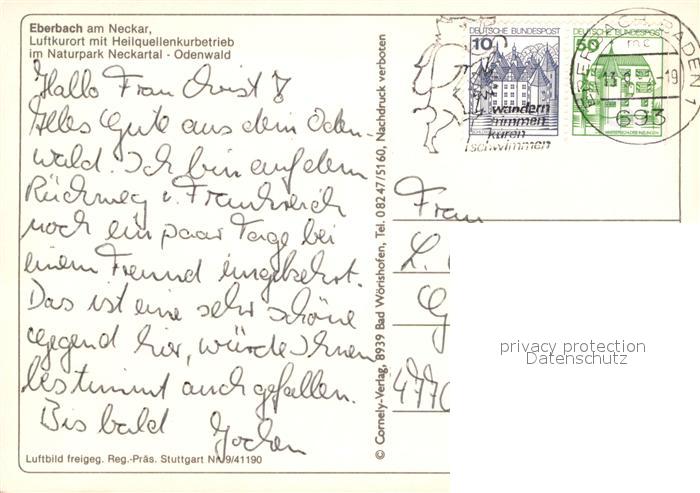 72960866 alte Postkarte Eberbach Neckar Fliegeraufnahme mit Katzenbuckel Neckartal postalisch gelaufen Erhaltung siehe scans [LiesaD40] KatCode: 11110008226013