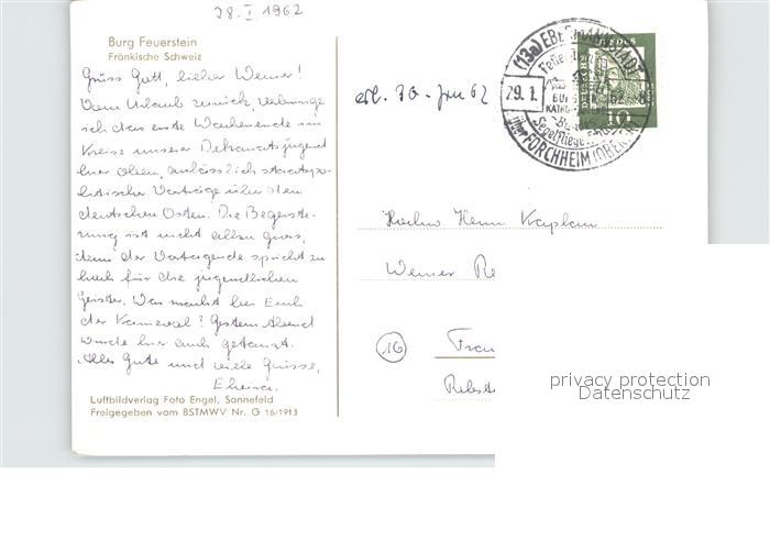 72581067 alte Postkarte Ebermannstadt Burg Feuerstein Fraenkische Schweiz Fliegeraufnahme postalisch gelaufen Erhaltung siehe scans [FriedD77] KatCode: 11110009474121