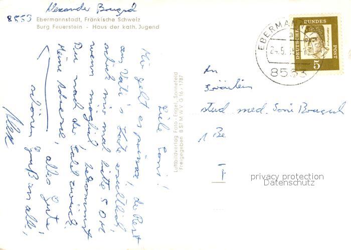 73098394 alte Postkarte Ebermannstadt Fliegeraufnahme Burg Feuerstein Haus der katholischen Jugend postalisch gelaufen Erhaltung siehe scans [KathaD81] KatCode: 11110009474121