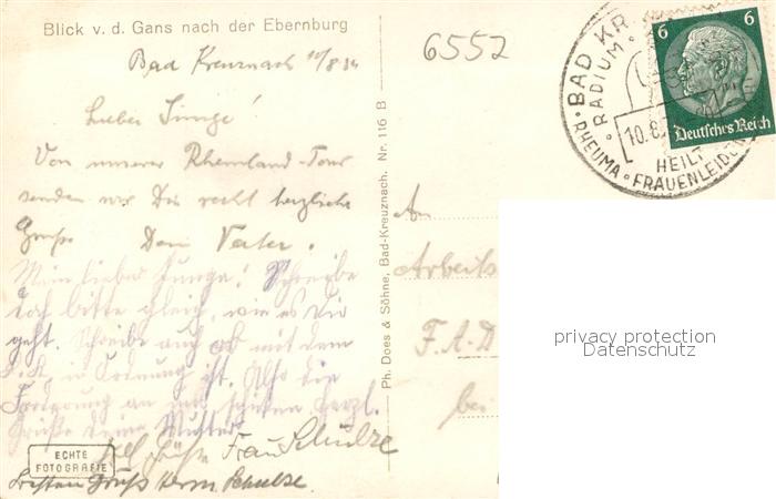73694561 alte Postkarte Ebernburg Blick von der Gans nach der Ebernburg Nahetal postalisch gelaufen Erhaltung siehe scans [FriedD77] KatCode: 11110007133007