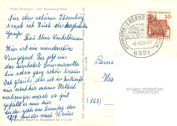 73155460 alte Postkarte Ebernburg Fliegeraufnahme postalisch gelaufen Erhaltung siehe scans [WerneD78] KatCode: 11110007133007