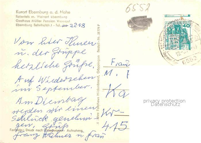 72844362 alte Postkarte Ebernburg Ortsansicht mit Kirche Rotenfels postalisch gelaufen Erhaltung siehe scans [FriedD77] KatCode: 11110007133007
