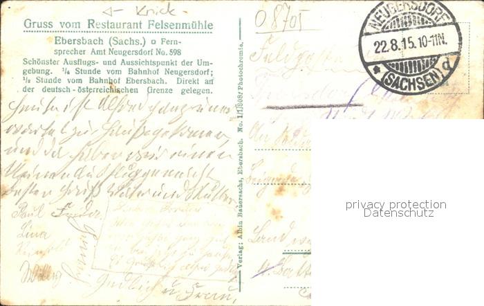42320274 alte Postkarte Ebersbach Sachsen Felsenmuehle mit Glas Veranda postalisch gelaufen Feldpost Erhaltung siehe scans KatCode: 11110014286070