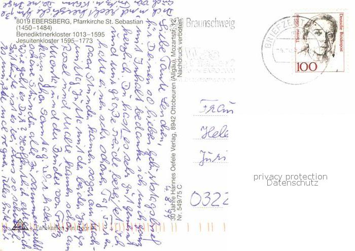 72711989 alte Postkarte Ebersberg Oberbayern Pfarrkirche St Sebastian postalisch gelaufen Erhaltung siehe scans [FriedD77] KatCode: 11110009175115