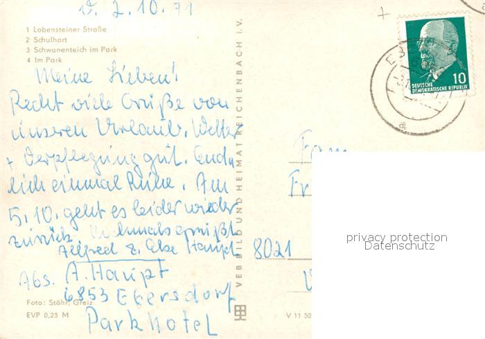73669568 alte Postkarte Ebersdorf Thueringen Lobensteiner Strasse Schulhort Schwanenteich Park postalisch gelaufen Erhaltung siehe scans [FriedD77] KatCode: 11110016075135