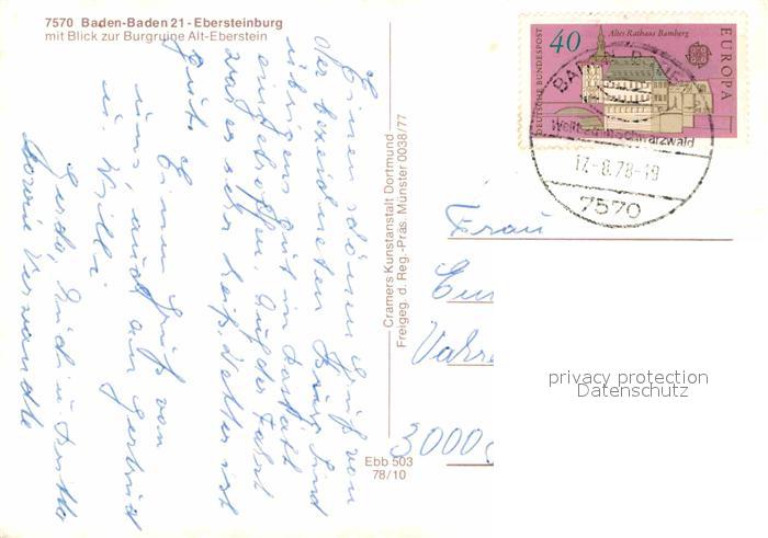 72852097 alte Postkarte Ebersteinburg Burgruine Alt-Eberstein postalisch gelaufen Erhaltung siehe scans [NatalD47] KatCode: 11110008211000
