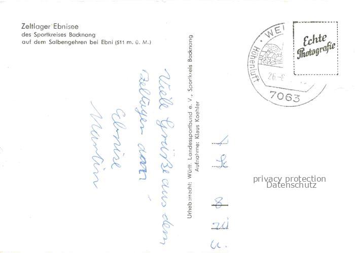 74092044 alte Postkarte Ebnisee Welzheim BW Zeltlager des Sportkreises Backnang auf dem Salbengehren bei Ebni postalisch gelaufen Erhaltung siehe scans [FriedD77] KatCode: 11110008119084