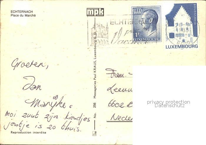 alte Postkarte Echternach Place du Marche postalisch gelaufen Erhaltung siehe scans