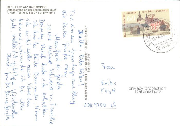 72522511 alte Postkarte ECKERNFoeRDE Ostseebad Campingplatz Karlsminde postalisch gelaufen Erhaltung siehe scans KatCode: 11110001058043