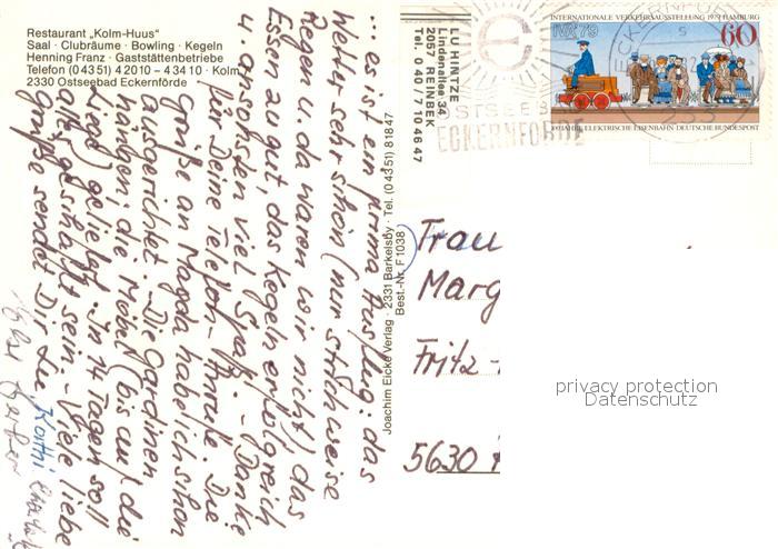 73659821 ECKERNFoeRDE Ostseebad Restaurant Kolm-Huus Saal Kamin Kegelbahnen Bowling postalisch gelaufen Erhaltung siehe scans [FriedD77] alte Postkarte Frie Katcode 11110001058043