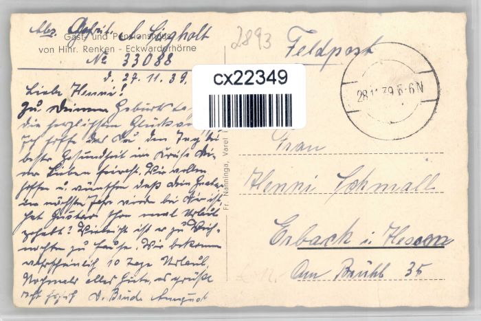 30738713 alte Postkarte Eckwarderhoerne ension Haus postalisch gelaufen KatCode: 11110003461003