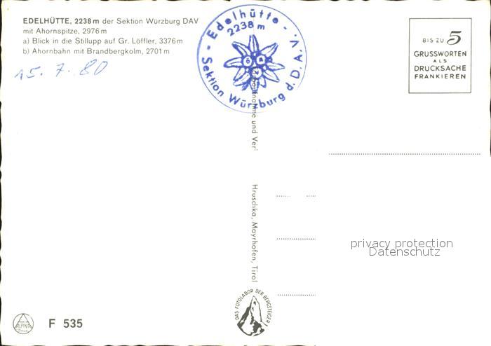 72450746 alte Postkarte Edelhuette mit Ahornspitze Stillupp Gr Loeffler Ahornbahn Brandbergkolm postalisch gelaufen Erhaltung siehe scans KatCode: 11390335070920