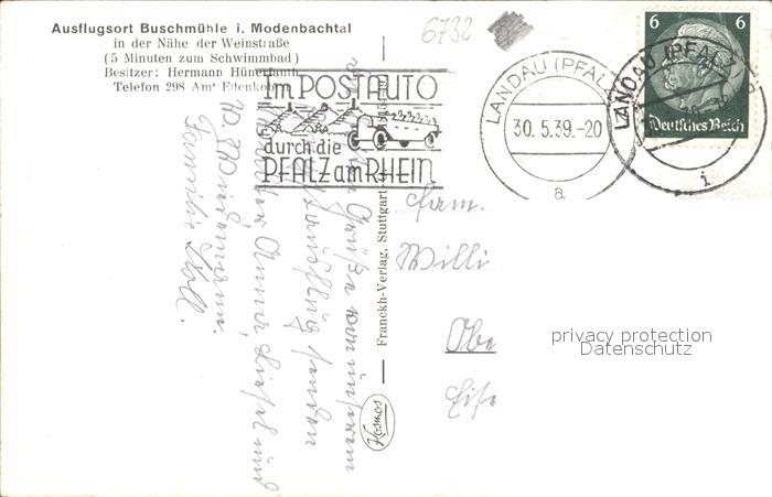 72094417 alte Postkarte Edenkoben Ausflugsort Buschmuehle im Modenbachtal postalisch gelaufen Erhaltung siehe scans KatCode: 11110007337020