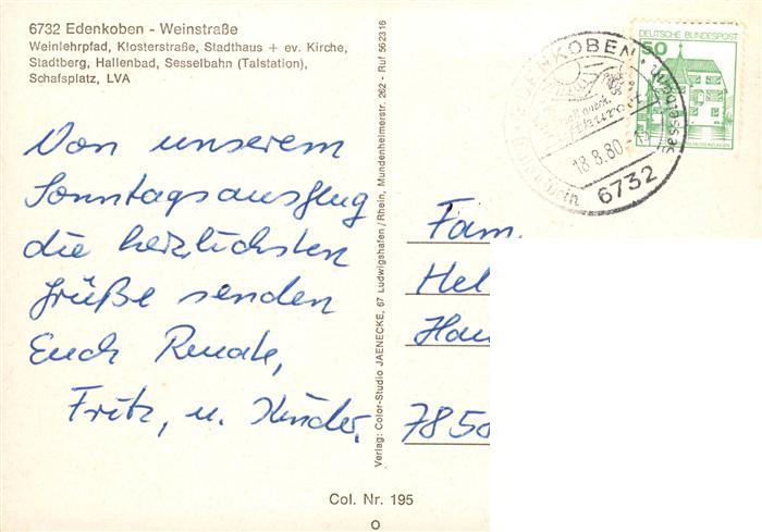 73904351 alte Postkarte Edenkoben Weinlehrpfad Klosterstrasse Stadthaus Ev Kirche Stadtberg Hallenbad Sesselbahn Schafsplatz postalisch gelaufen Erhaltung siehe scans [FriedD77] KatCode: 11110007337020