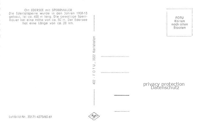 Edersee Edertal Hessen mit Sperrmauer Fliegeraufnahme postalisch nicht gelaufen Erhaltung siehe scans [WerneD78] Wern Katcode 11110006635009